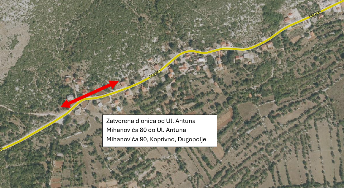 Zbog radova na sanaciji kolnika, u četvrtak, 13. studenoga 2025. godine od 08:00 do 17:00 sati, bit će za sav promet zatvorena dionica javne lokalne ceste LC 67076, od stacionaže 1+700 do 1+900, tj. Ulica Antuna Mihanovića, Koprivno, općina Dugopolje, od kućnog broja 80. do kućnog broja 90. Obilazak će biti državnim cestama D56 i D1.